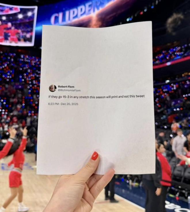此前,有一位网友在推特上发文表示:“如果快船在本赛季任意阶段打出18场赢15场的表现,他就把那条推文打印出来并吃掉。”