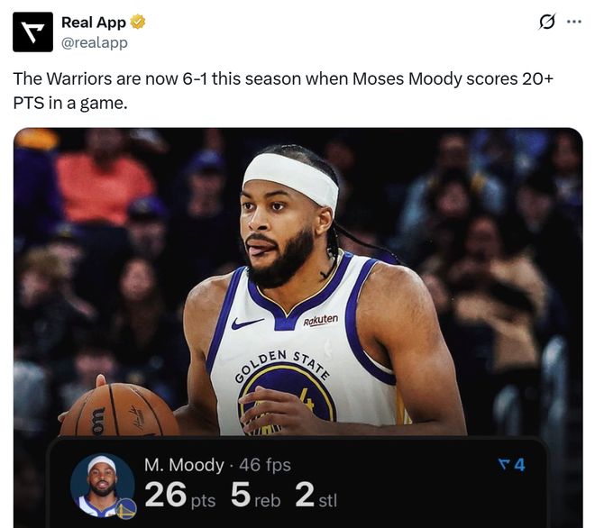同时这是本赛季穆迪第7次拿到20+得分表现,当他拿下20+得分时,勇士交出6胜1负战绩。