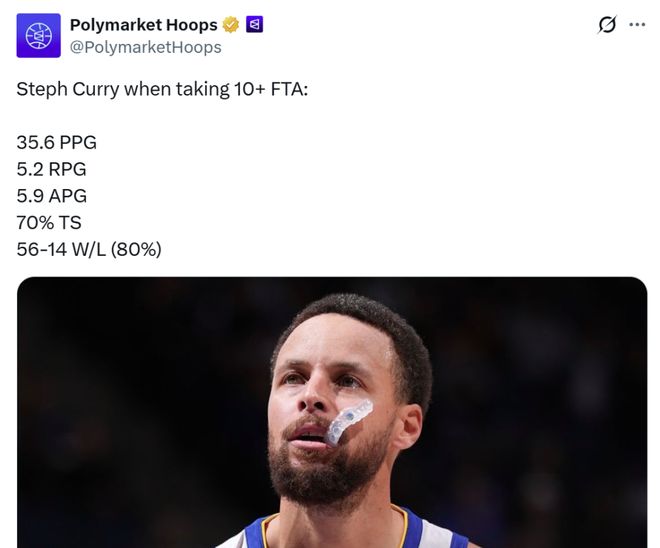 拿下这一场胜利后,当库里单场获得10+罚球时,勇士战绩提升至56胜14负,胜率高达80%,期间库里场均轰下35.6分5.2板5.9助,真实命中率70%。