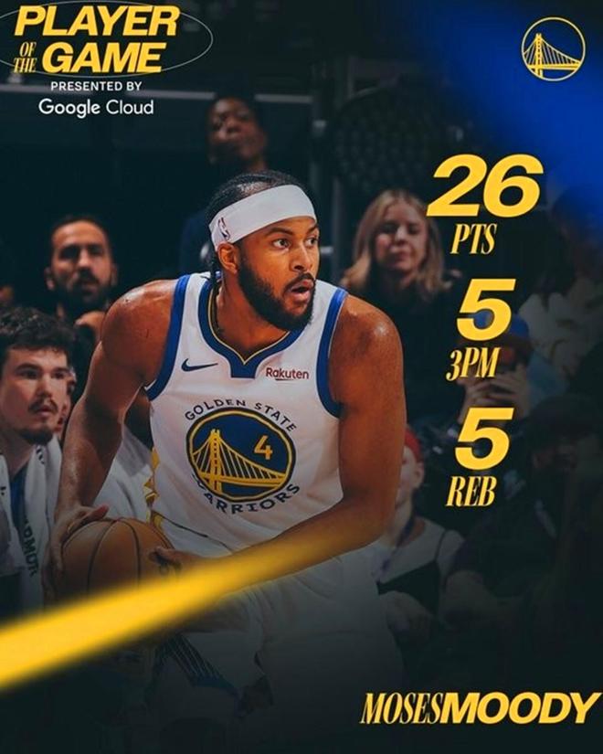 其中一人力压库里成勇士官方认可的全场最佳,那就是首发出战的穆迪,全场穆迪在仅出战26分钟的情况下,15中9,三分9中5,轰下26分5板2抢断全能数据,正负值+28全场最高。