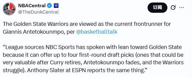 北京时间1月30日,据NBC体育报道,消息人士透露,金州勇士队处于字母哥争夺战的领跑位置,因为他们最多能拿出四个首轮签(考虑到库里退役、字母哥状态下滑后勇士或将陷入挣扎,这些选秀权未来价值可期)。勇士队记Slater也给出了相同报道。联盟高管认为:“雄鹿越快交易字母哥,勇士在竞价大战中胜出的几率就越大。”