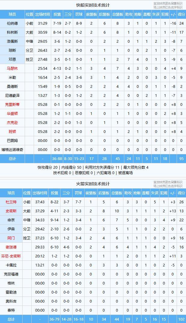 快船:伦纳德24分8板3助、科林斯17分8板1助、马瑟林9分7板4助3断、米勒9分4板2助、洛佩斯7分2板、邓恩6分2板7助4断、琼斯6分1板2帽、杰克逊5分1板