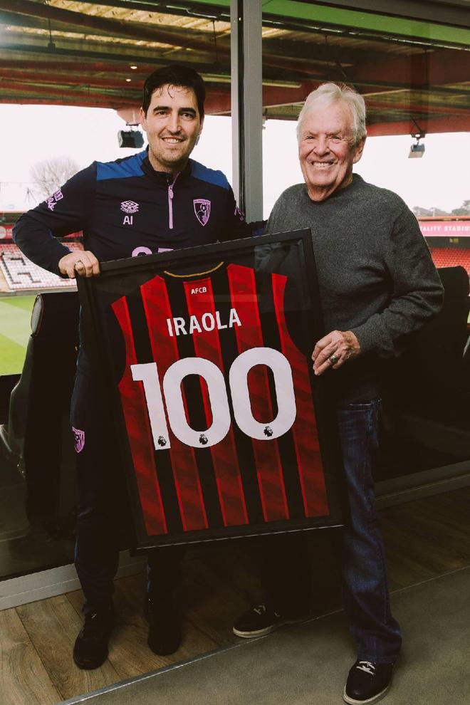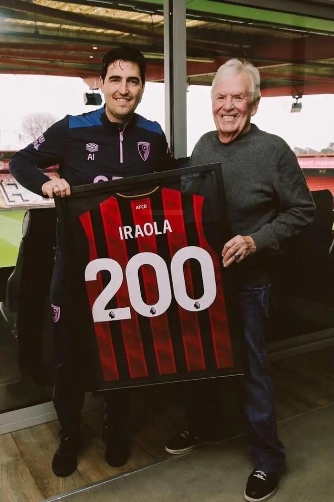 日前,伯恩茅斯官方在社交媒体上发布一则动态,主席比尔-弗利为主帅伊劳拉送上了一件100场纪念球衣。
